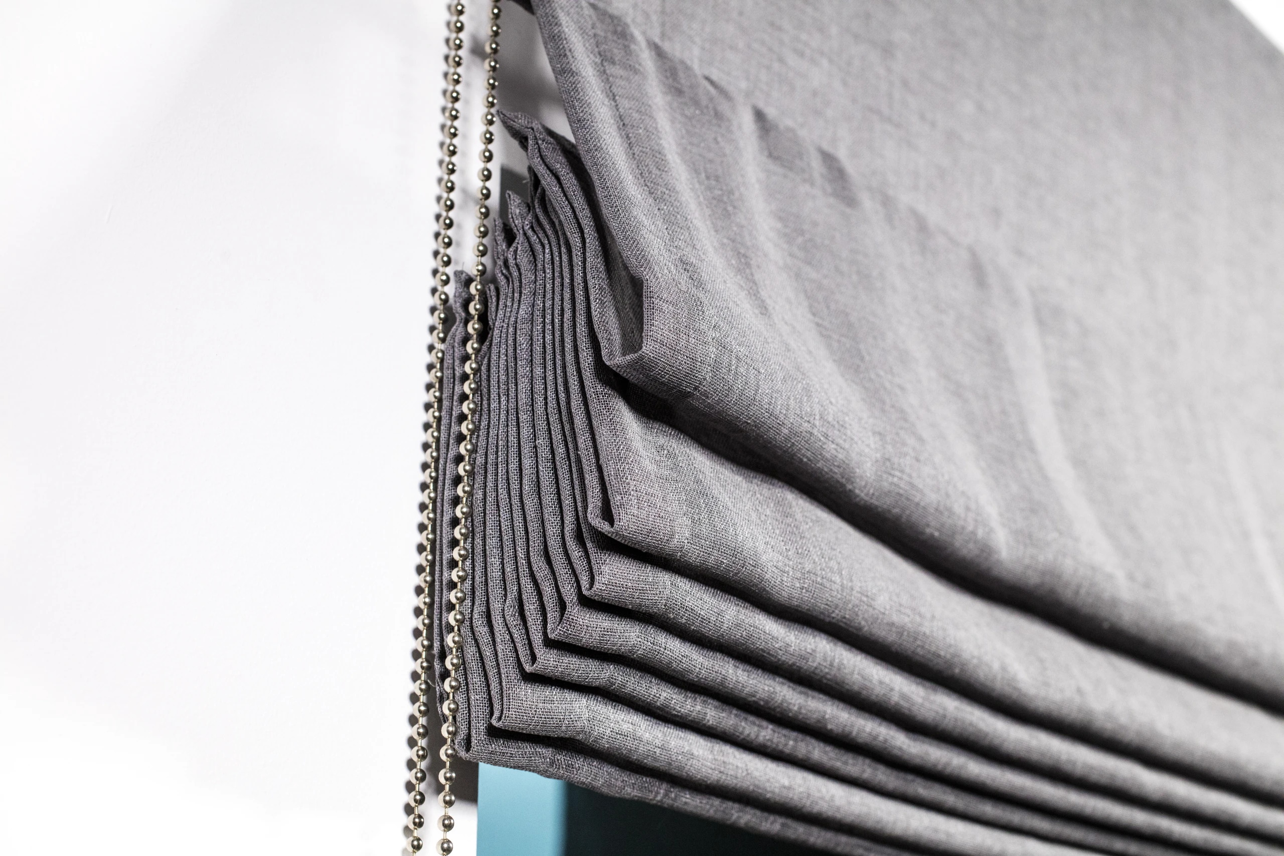 Dunkles Raffrollo mit Raffungen in Nahaufnahme mit Kugelkette